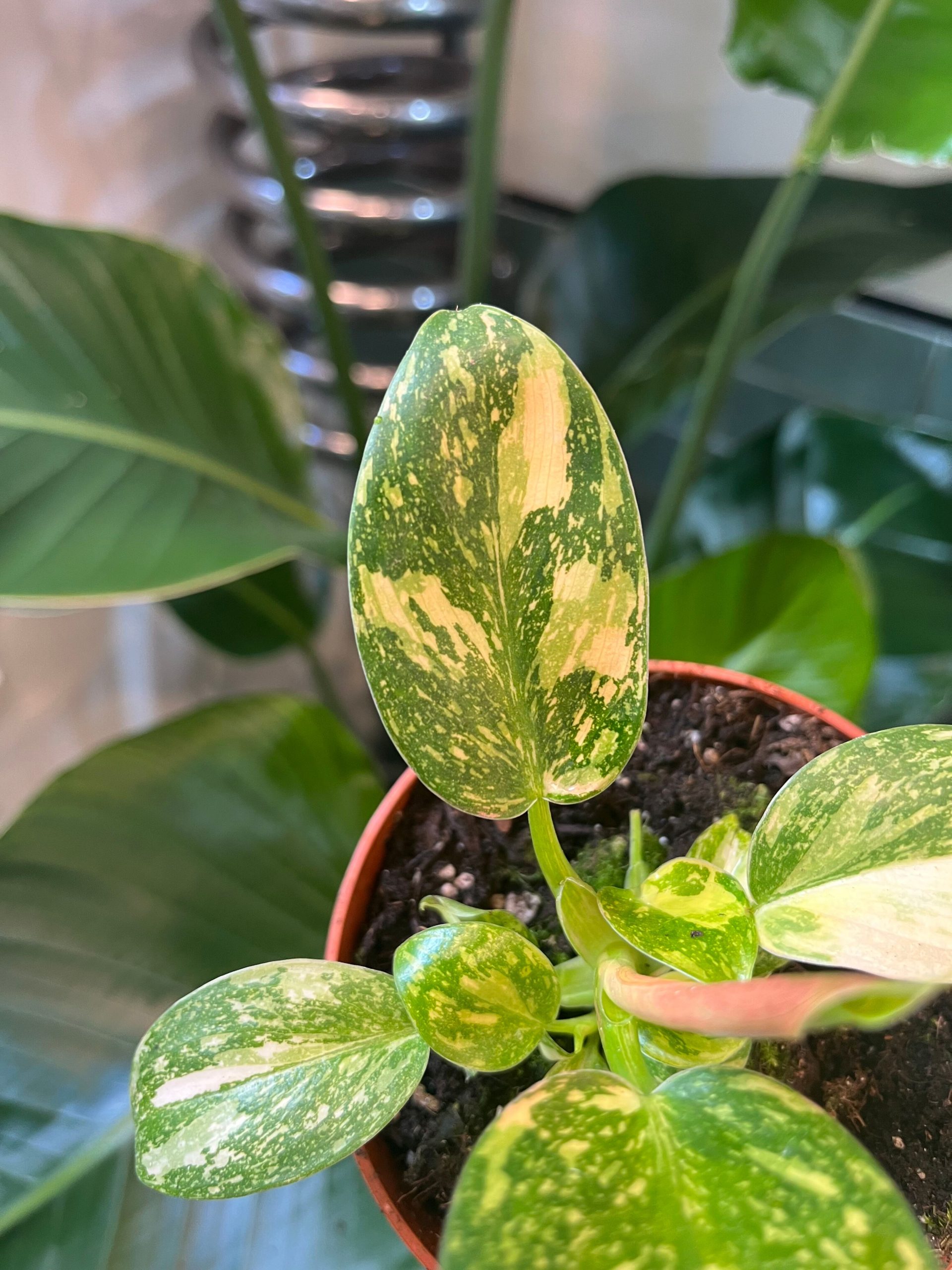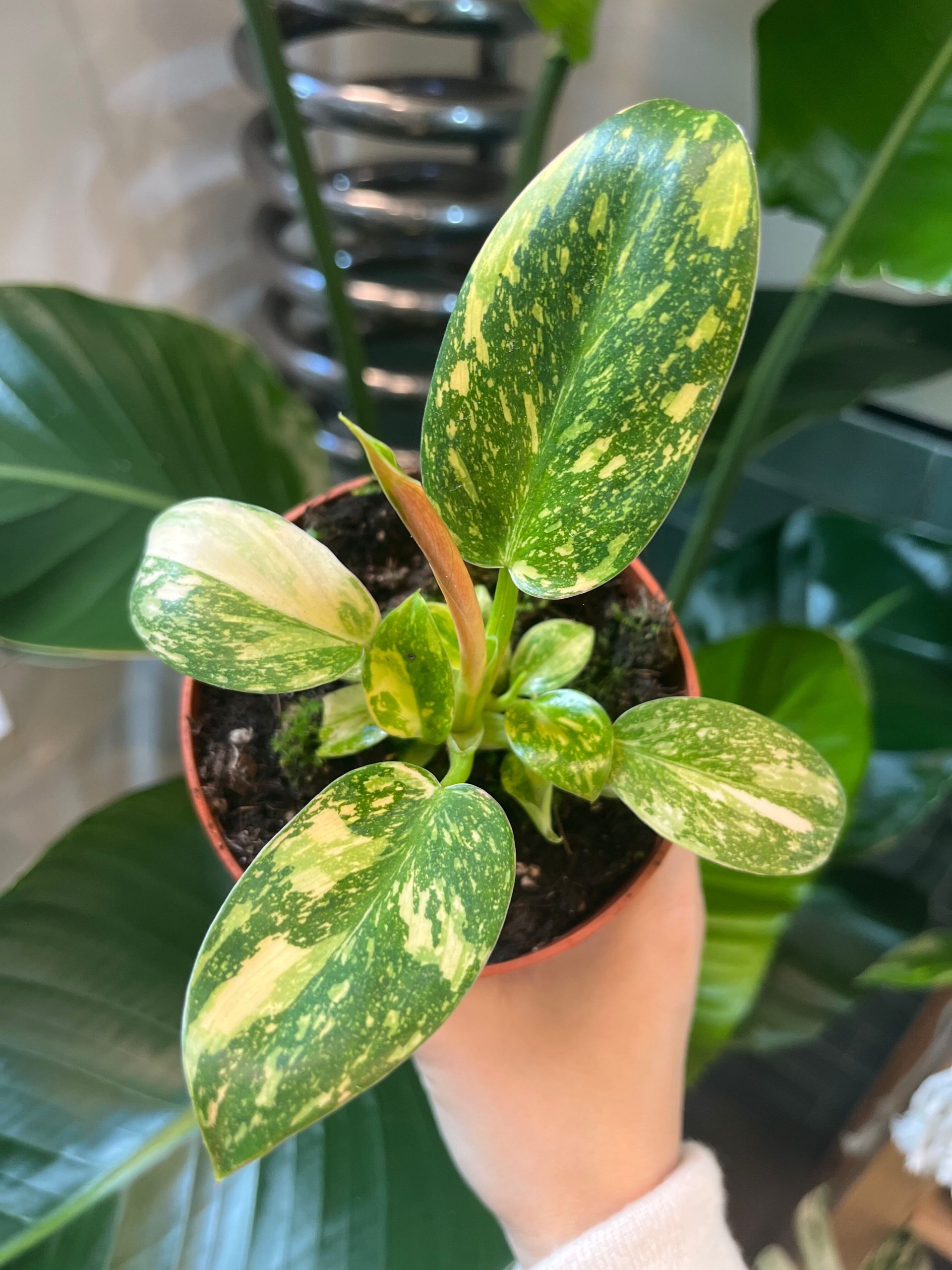 De Philodendron Green Congo Variegata is een gekweekte hybride Philodendron soort met mooie vlekkerige crèmekleurige variegata. Komt in een kweekpot met Ø 10 cm en is ongeveer 20 cm hoog.